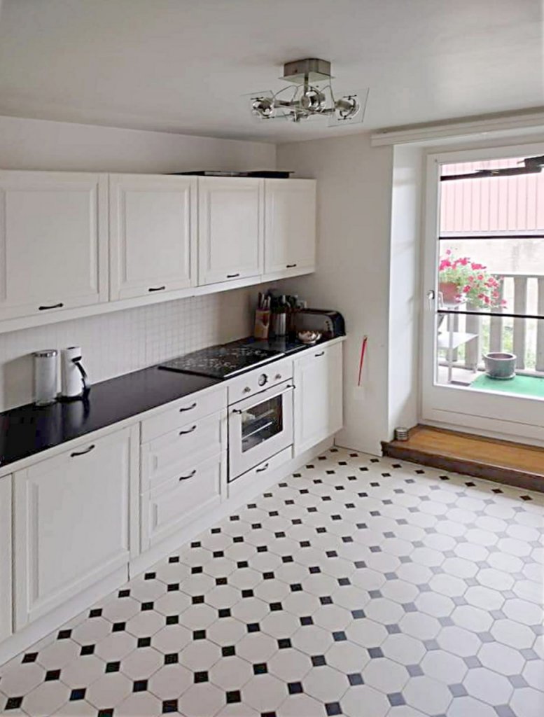 Hall d'entrée, séjour avec poêle d'ornement, cuisine agencée, 1 chambre, salle de bains/WC, lave-linge, balcon, cave.