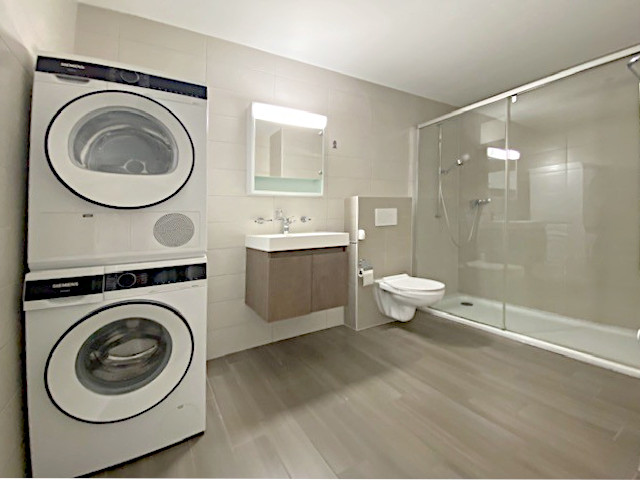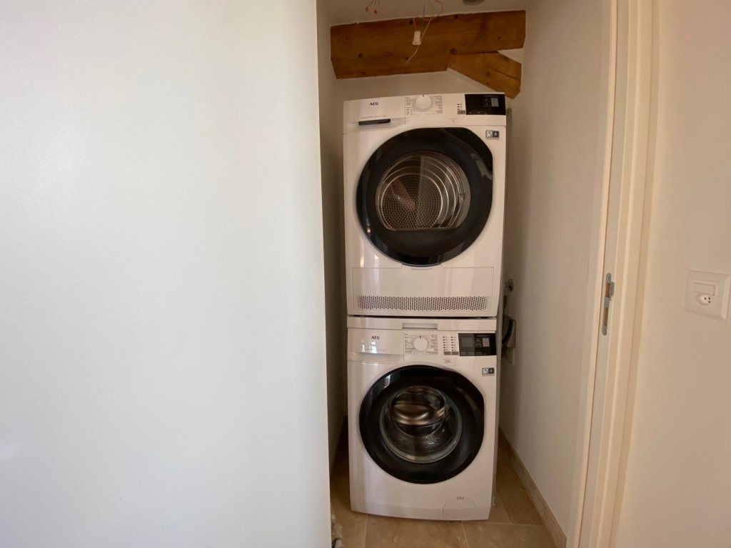 - Une salle de bains avec colonne de lavage et séchage