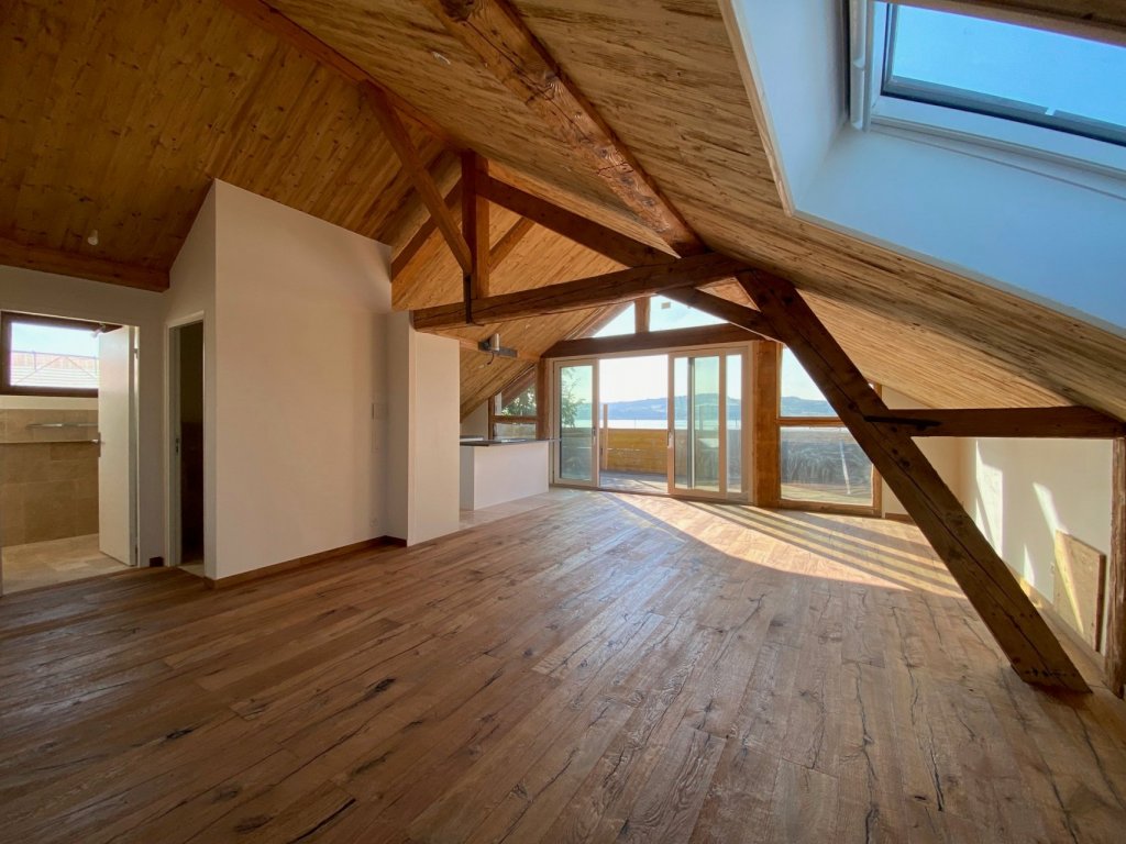 Magnifique appartement en attique offrant de généreux volumes, une vue dégagée ainsi qu'une légère échappée sur le lac. Sa surface habitable de 100 m2 + un balcon de 12 m2 en font un grand appartement de 3,5 pièces.